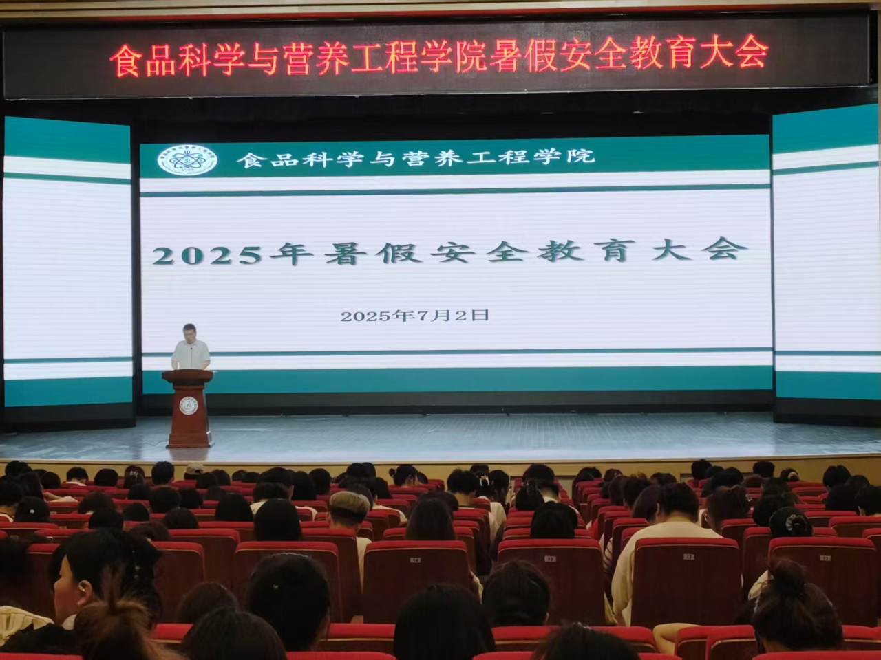 7月2日,食品科学与营养工程学院在大学生活动中心召开2025年暑假安全教育大会,学院党总支书记吕闻明、副书记张志强及全体辅导员、在校学生参会。会上,吕闻明围绕“筑牢安全防线,乐享平安假期”作主题宣讲,重点强调了人身、财产及意识形态等安全防范要求,并勉励同学们合理规划假期,在保障安全的同时充实自我、提升能力。此次大会进一步增强了师生的安全意识与自我保护能力,为学院师生度过平安、充实的暑假奠定了坚实基础。