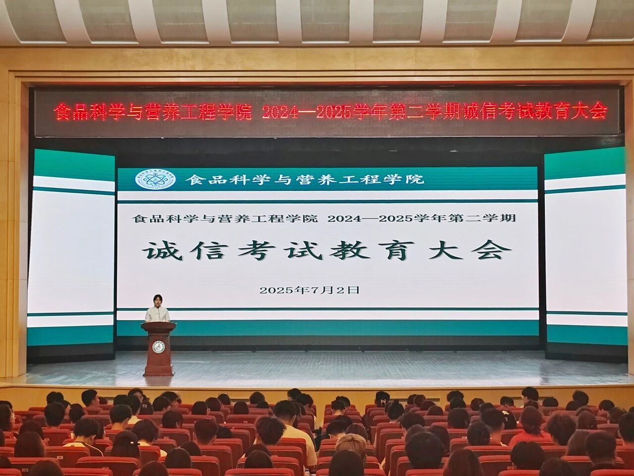 7月9日,食品科学与营养工程学院在大学生活动中心召开2024—2025学年第二学期诚信考试教育大会,学院党总支书记吕闻明、副书记张志强、学生工作办公室主任谢天、团委负责人王丽娜及全体学生参会,会议由辅导员李程主持。会上,李程宣读《吉林农业科技学院学生考试违规作弊处理办法》,学生党员代表贺坤明、学生代表迟佰慧先后发言,梁娟娟宣读并领誓诚信考试承诺书,全体学生集体宣誓遵守考纪、诚信应考。