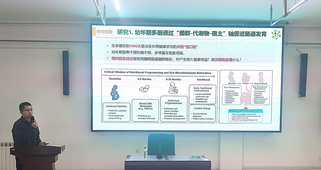 报告中,卢烽博士详细介绍了其研究团队的最新成果。幼年期补充葡萄多酚能够显著调节肠道菌群组成,并揭示了一个由“乳杆菌属(Lactobacillus)—宿主结肠屏障功能—艾克曼菌属(Akkermansia)”构成的链式效应机制。这一创新发现为理解生命早期营养干预如何通过“肠-轴”影响终生健康提供了新的科学视角和实验依据。